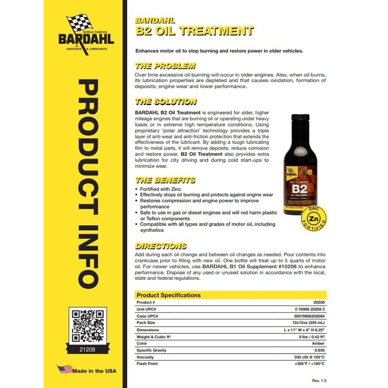 BARDAHL ALL-U-NEED! B2 Oil Treatment is engineered for older, higher mileage engines that are burning oil or operating under heavy loads or in extreme high temperature conditions. Using proprietary 'polar attraction' technology, B2 Oil Treatment provides a triple layer of anti-wear and anti-friction protection that extends the effectiveness of the lubricant. By adding a tough lubricating film to metal parts, it will remove deposits, reduce corrosion and restore power. This ALL-U-NEED! solution also provides extra lubrication for city driving and during cold start-ups to minimize wear.
