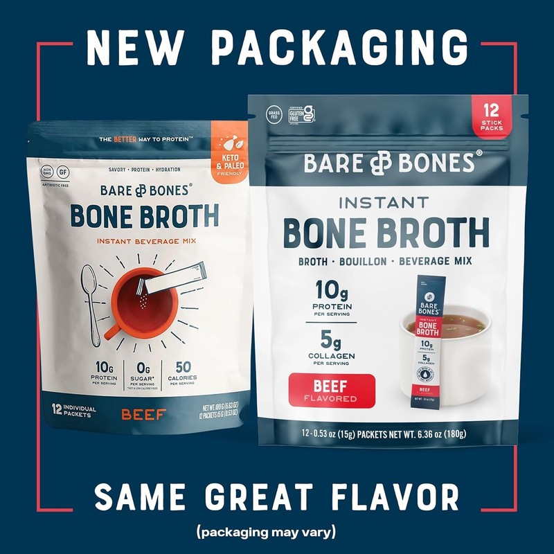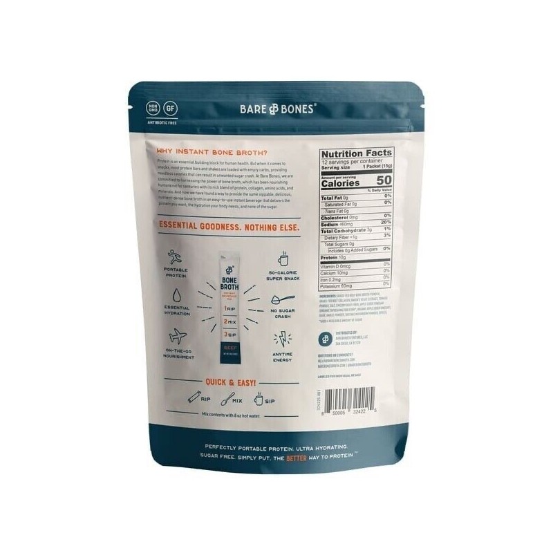 Bare Bones Bone Broth Instant Powdered Mix Beef Pack of 12 15g Stick 10g Protein