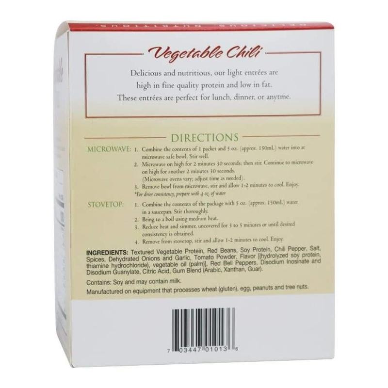 Ingredients: Textured Vegetable Protein, Red Beans, Soy Protein, Tomato Powder, Chili Mix, White Onions, Artificial Flavor (Hydrolyzed Soy Protein, Thiamine Hydrochloride), Vegetable Oil (Palm)], Red Bell Peppers, Salt, Cumin, Citric Acid, Xanthan Gum.
