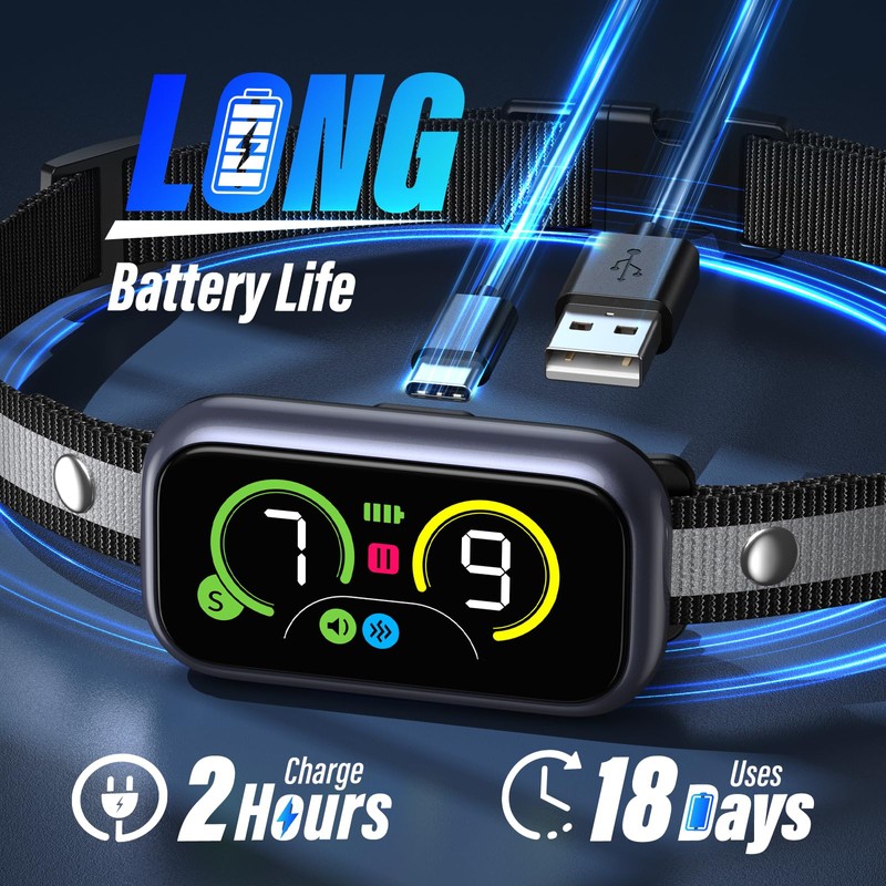 - 【Quick Charging, Long Life – Train Without Interruptions】Forget daily charging. This anti barking device for dogs powers up in just 2 hours and lasts up to 18 days on a single charge. Thanks to its Type-C port, it also delivers improved waterproofing. Whether you're using it as a bark collar for medium dogs or a bark collar for small dogs 5–15lbs, this collar is ready for indoor cuddles or outdoor adventures