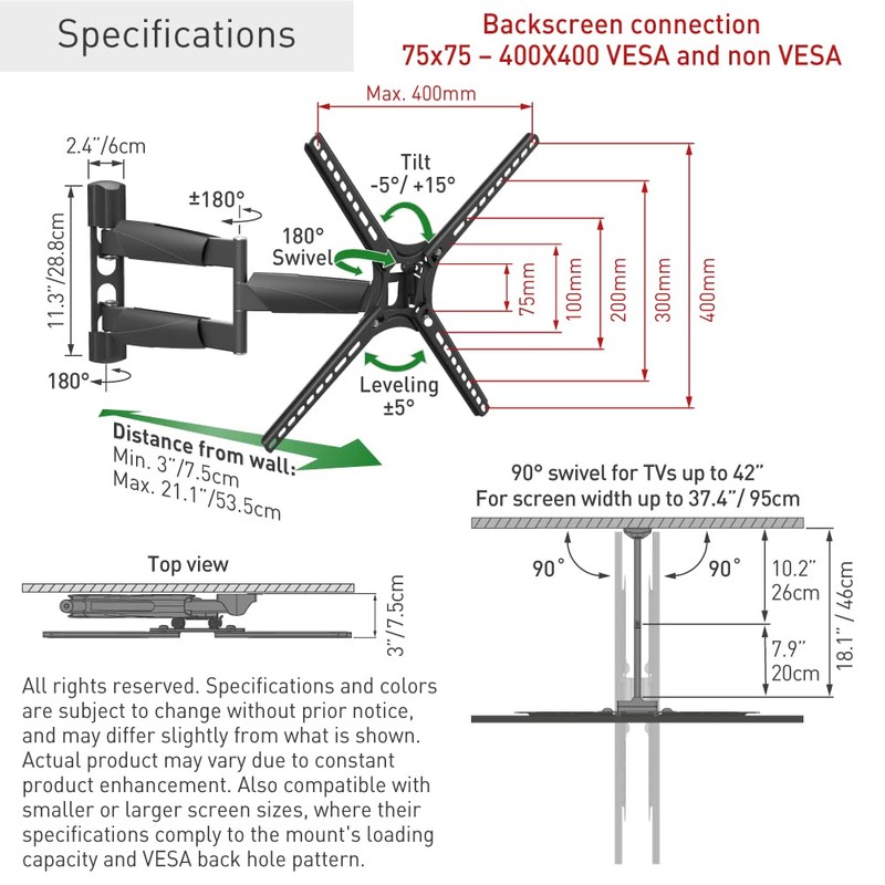 The Barkan full motion, four - movement TV mount with rotate, fold, swivel and tilt options. Fits flat / curved screens sizes 13 - 65 inches and weight up to 80 lbs. The minimum distance between the mount and the wall is only 2.9 in. and the maximum distance is 21 in. It is extremely extendable in open position therefore allows viewing from a variety of places and locating the screen around the corner of a wall. Fits TVs with VESA standard (Bracket Mounting Holes Patterns) 75x75, 100x100, 100x200, 200x100, 200x200, 300x300, 300x400, 400x200, 400x300, 400x400 mm and non VESA up to 400x400 mm. In order to offer a better point of view, the mount has three pivots: near the wall 180 degrees, fold 360 degrees, swivel near the screen connection plate 180 degrees and also tool free tilt from -5 till 15 degrees. The mount has a lifetime warranty and its color is black. Please check the list of included screen-connection screws in the assembly instructions. If your screen requires different screen-connection screws, please purchase them in your local hardware store or consult us at sales.usa@barkanmounts.com. **If you are satisfied with the product, please leave a review. If you are not satisfied please contact us at https://www.barkanmounts.com/support and we will solve the problem for you**