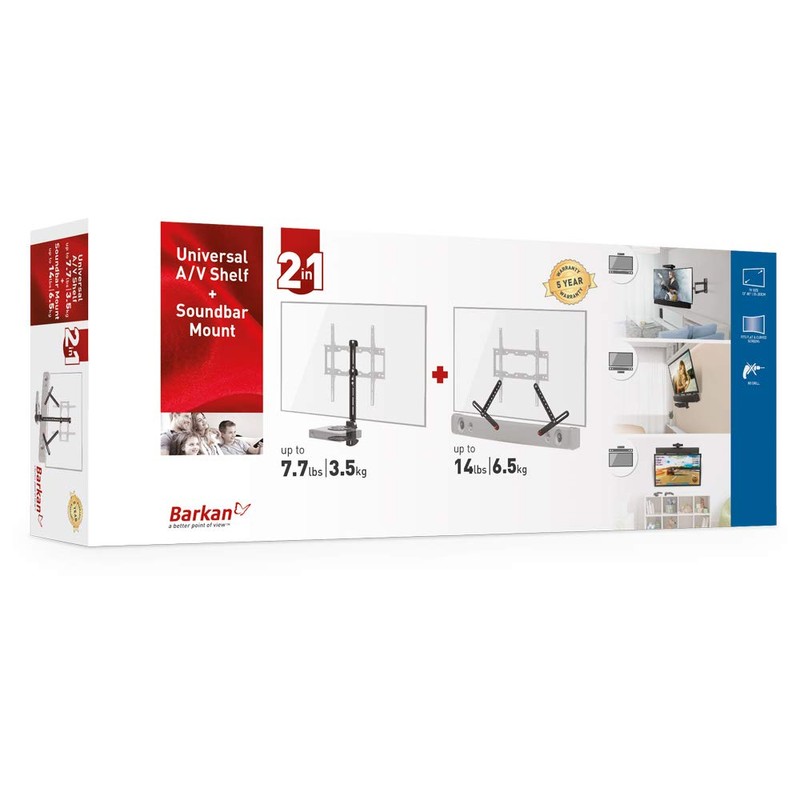 The Barkan soundbar mount + universal AV shelf has a conjunctive structure to allow ultimate compatibility to a wide range of TV and Soundbar sizes. The AV shelf holds up to 7.71 lbs and supports components 0.78 to 3.1 inch high. The Soundbar mount holds up to 14 lbs. Both are suitable for flat and curved TVs and can be installed above or below the screen. It is installed by connecting the steel arms to the TV mount therefore spares the need for drilling holes. It's suitable for all Barkan mounts (excluding EA02) and most TV mounts brands in the market. The mounts have a 5 year warranty and their color is black. **If you are satisfied with the product, please leave a review. If you are not satisfied please contact us**