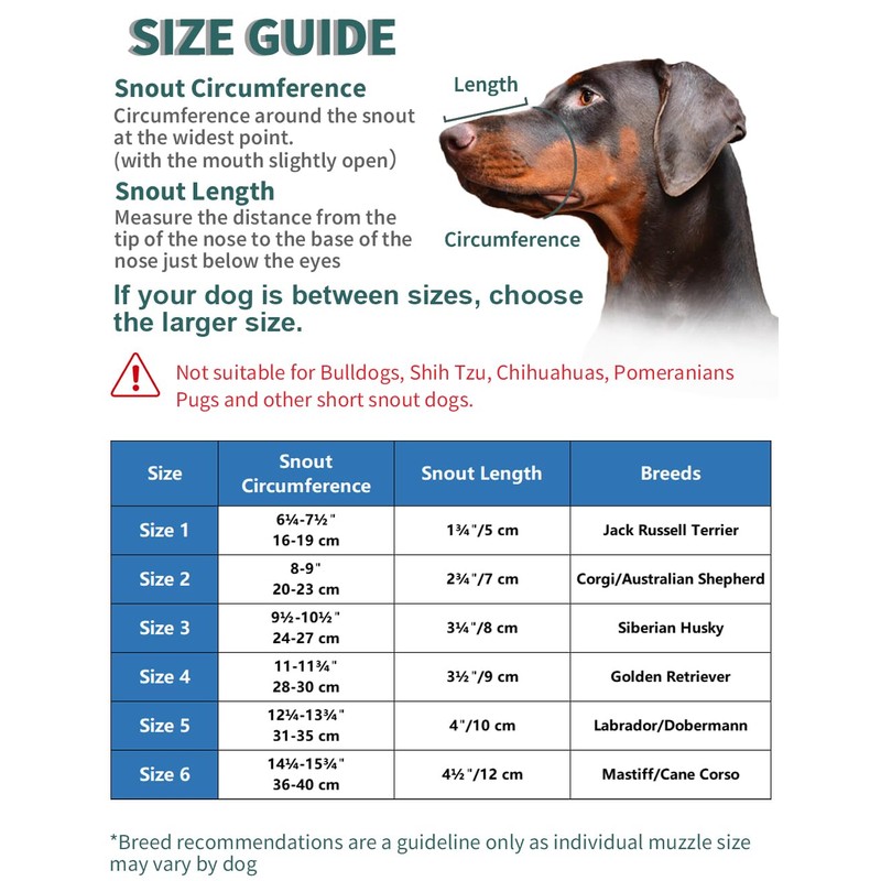 - PLEASE MEASURE BEFORE BUYING: Snout circumference and snout length must be measured both. If the circumference fit one of the sizes in the size chart, but the length is over the maximum range of this size (about 1 inch), you should choose the next size for a better fit. For long-snout dogs like Doberman, please make sure the dog's snout length fits the size