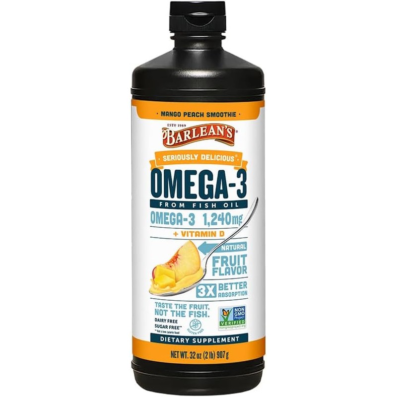 Barlean's Mango Peach Omega 3 Fish Oil Liquid Supplement with Vitamin D, 1080mg EPA & DHA Fatty Acid, Smoothie Flavored & Burpless for Brain, Joint, & Heart Health, 32 oz