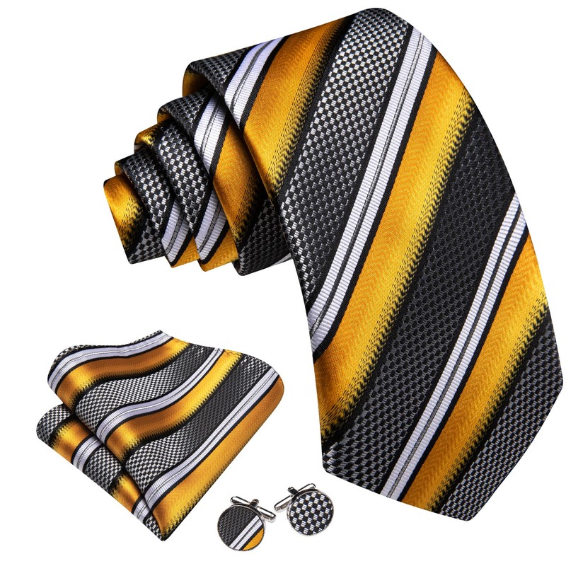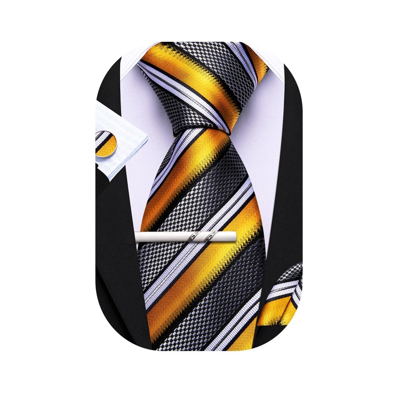 Barry.Wang Men's Tie Set Silk Business Stripes Plaid Tie Set with Handkerchief Cufflink for Wedding Formal, Black / White / Yellow