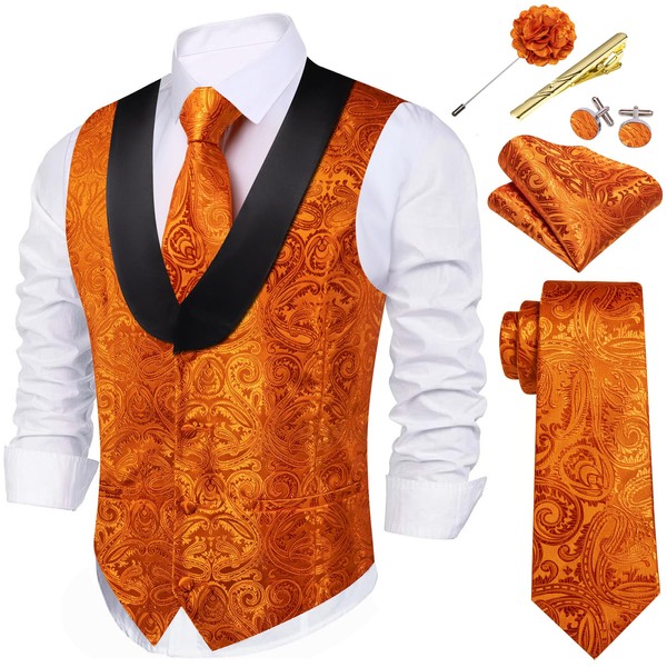 Barry.Wang Mens Paisley Vest Tie Set Burnt Orange Silk Jacquard Shawl Collar Formal Suit Waistcoat Festival Party