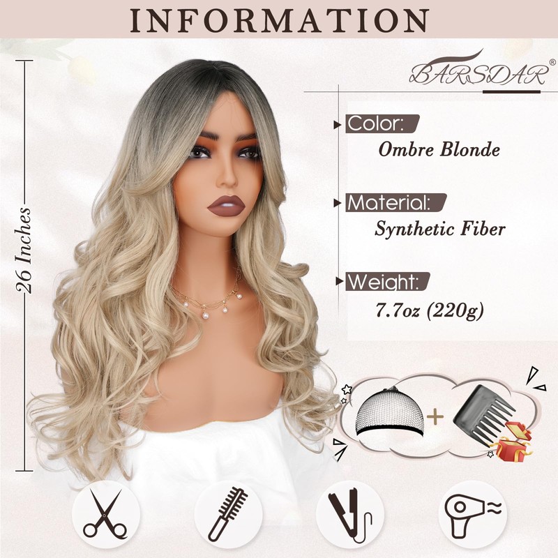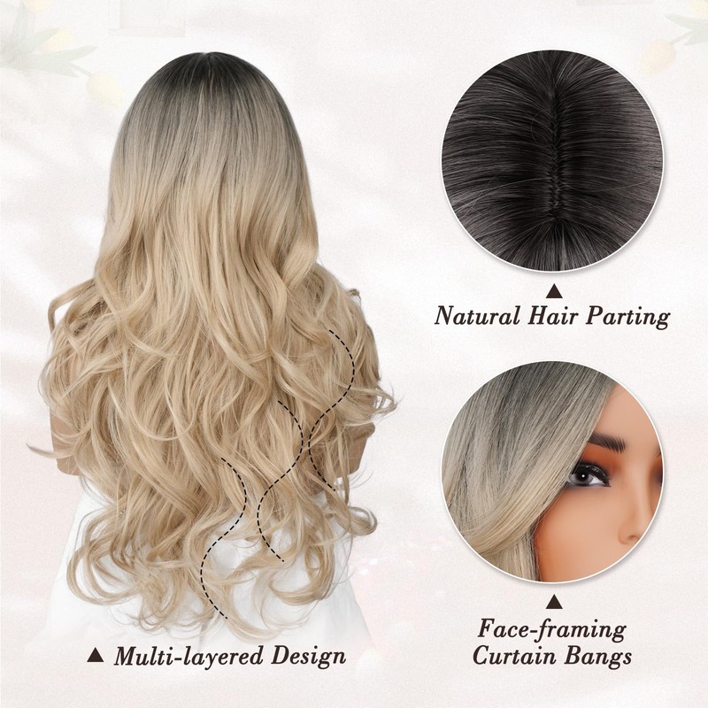 BARSDAR Long Wavy Curtain Bangs Wig - 26 Inch Long Layered Blonde Wig with Dark Roots for Women - Synthetic Sabrina Wigs Butterfly Haircut Curtain Bangs Soft Natural Looking - Ombre Blonde