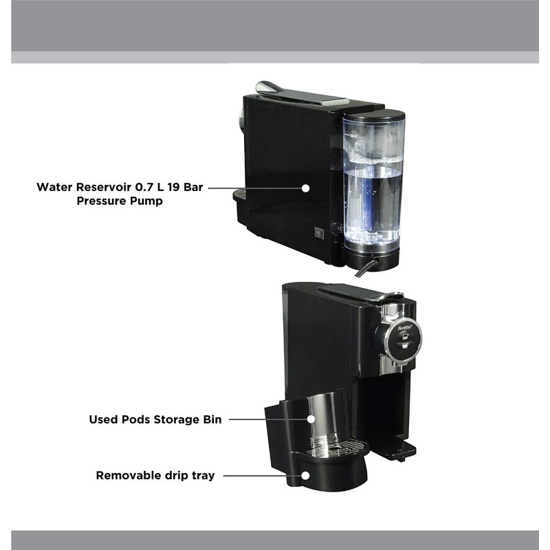 Barsetto Espresso Machine makes great tasting espresso with perfect cream allowing you to enjoy the hot beverage in the convenience of your own home. Equipped with a die-casting aluminum broiler and 19 bar high pressure pump plus used espresso pods can conveniently be dropped into the storage compartment. Features a sleek, modern design combined with an attractive stainless steel/black finish coordinating well in any kitchen. Product is compatible with Nespresso.