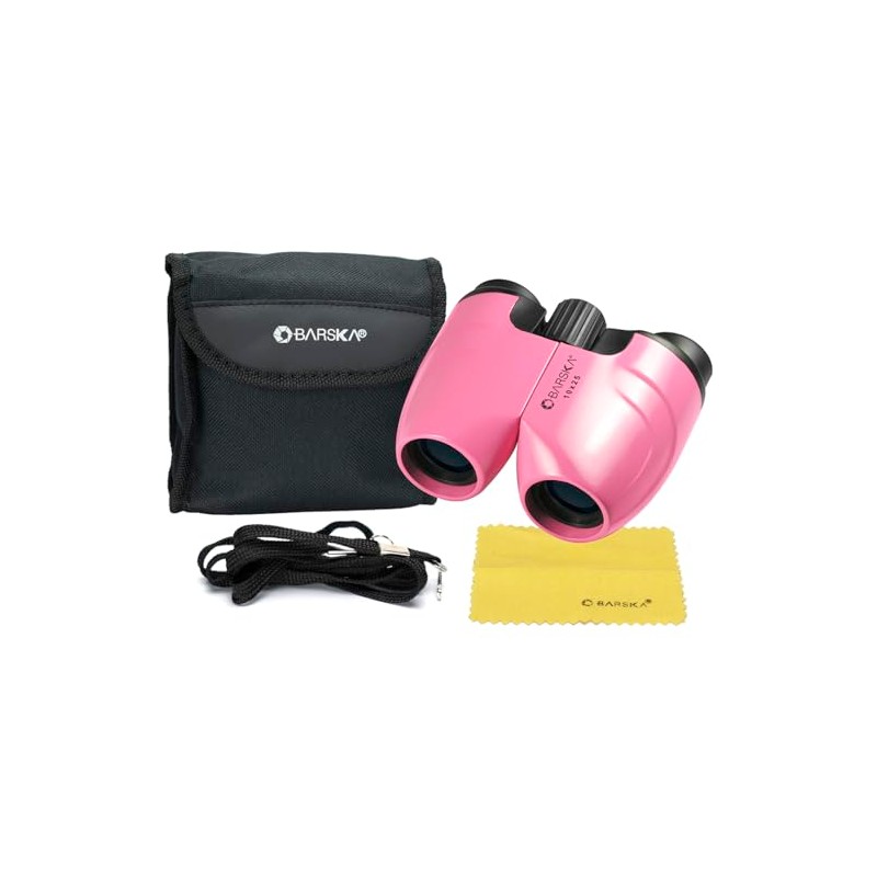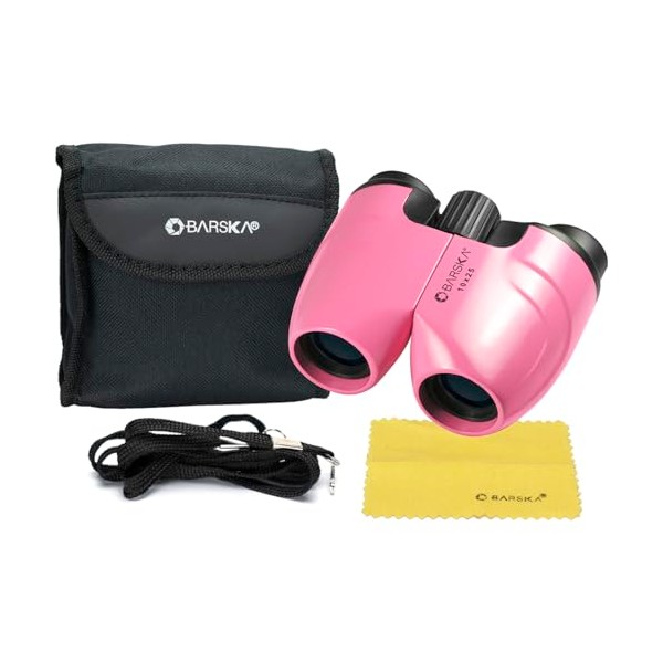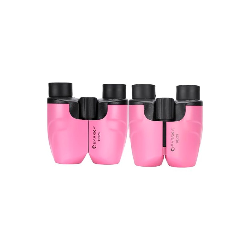 Amazon.comAdjustable eyecups and a large center focus knob allow quick, clear downrange viewing. BARSKA 10x25 Pink Porro BinocularThe BARSKA Colorado 10x25 waterproof binocular is made for all outdoor activities. Sized and priced just right, this versatile binocular will give you great views of the outdoors, athletic events, or whatever activity you choose. The Pink Porro binocular is a must-have for long hikes, camping, or backpacking adventures. Stylish PowerGet a crisp, clear view of the action -- and look good doing it -- with these snazzy pink binoculars from renowned optics company BARSKA. Ideal for sporting events and outdoor activities, the eye-catching binoculars offer 10X magnification via the 25-millimeter objective lens. A large, easy-to-use center focus knob lets you quickly view downrange, and fully coated optics maximize light transmission and include a Porro prism with BK-7 glass. What's in the BoxIn addition to your binocular purchase, you will receive a carrying case, neck strap, and lens cloth. Product Specifications Magnification: 10xl Objective Lens: 25mm Prism type: Roof Prism Glass: BK-7 Fully coated optics Field of View: 288/100 Eye Relief: 11mm Warranty: Limited Lifetime Warranty Weight: 7.2 oz.Product DescriptionThe 10x25 Pink Colorado Binocular from Barska is a lightweight compact binocular that is well-suited for hiking, bird watching, and sightseeing. Fully coated optics minimize glare and transmit bright contrast-rich images. BK-7 Porro prisms render clear, high-detail images even in dim light, ensuring that this Colorado series binocular will perform in a wide range of lighting conditions.