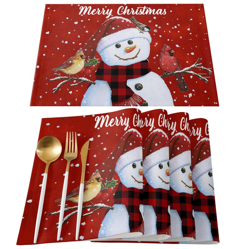 BARTHKIT Placemats, Christmas Snowman Placemats Set of 4 for Dining Table, Xmas Bird Winter Snowflake Red Place Mats for Outdoor Home Party Kitchen Dining Decor 13 x 19 Inch