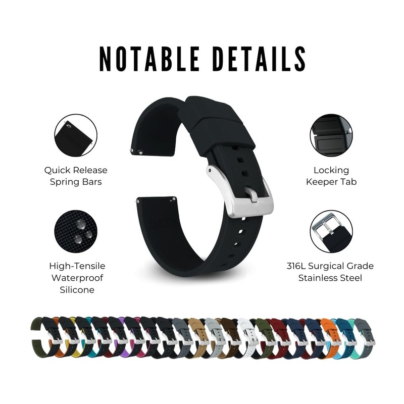 - LOCKING FEATURE and OTHER ATTRIBUTES: BARTON’s proprietary locking feature assures that the free end of the strap stays securely in place. Quick release spring bars, durable silicone, solid tang 316L stainless steel buckle, scent free and dust free, 2mm taper from watch head to buckle.