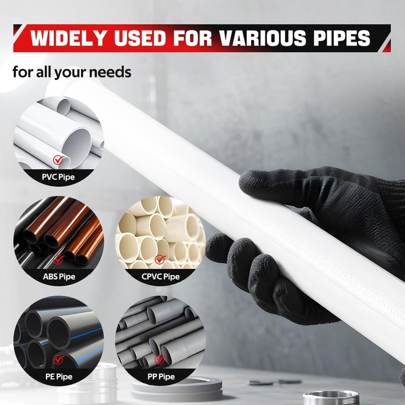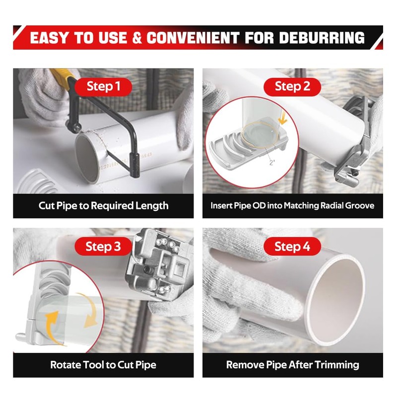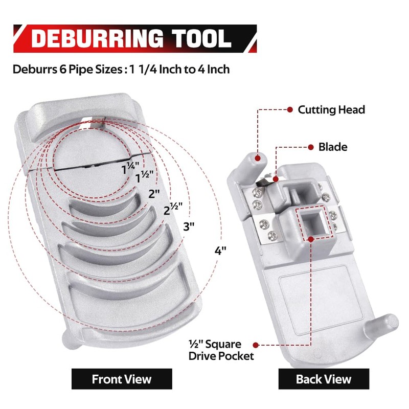 - Deburrs Six Pipe Sizes: Deburrs six different pipe sizes from 1-1/4 to 4 inches for PVC, CPVC, ABS, PP, and PE pipe, making it an ideal tool for a variety of plumbing projects. Easy to carry and fits in your tool bag.