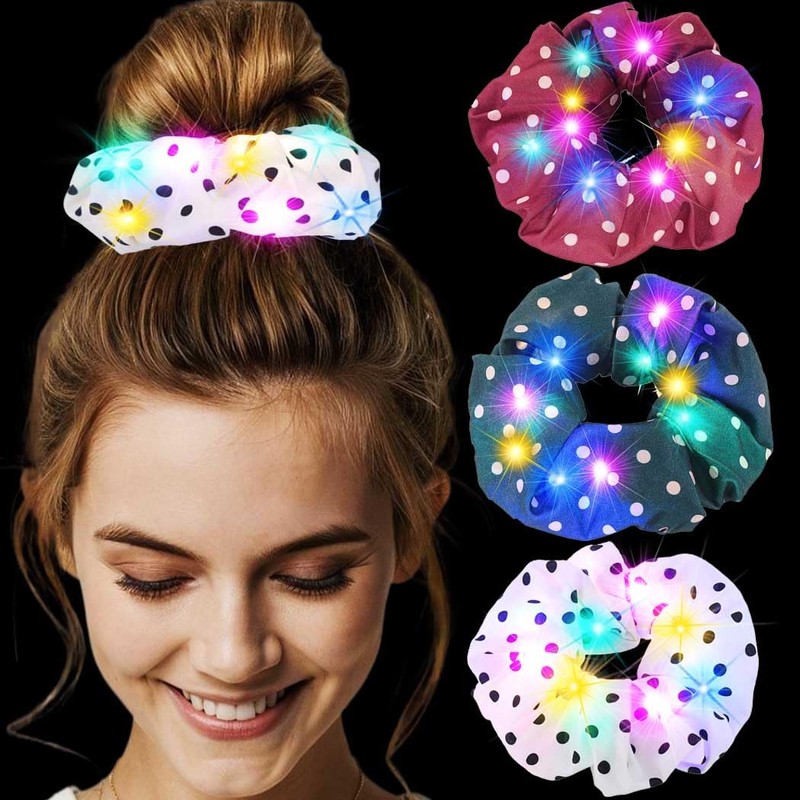 - Light up hair scrunchies made of polyester and led light, these polka dots scrunchies are soft, thick, stretchy and sturdy, no damage for your hair.