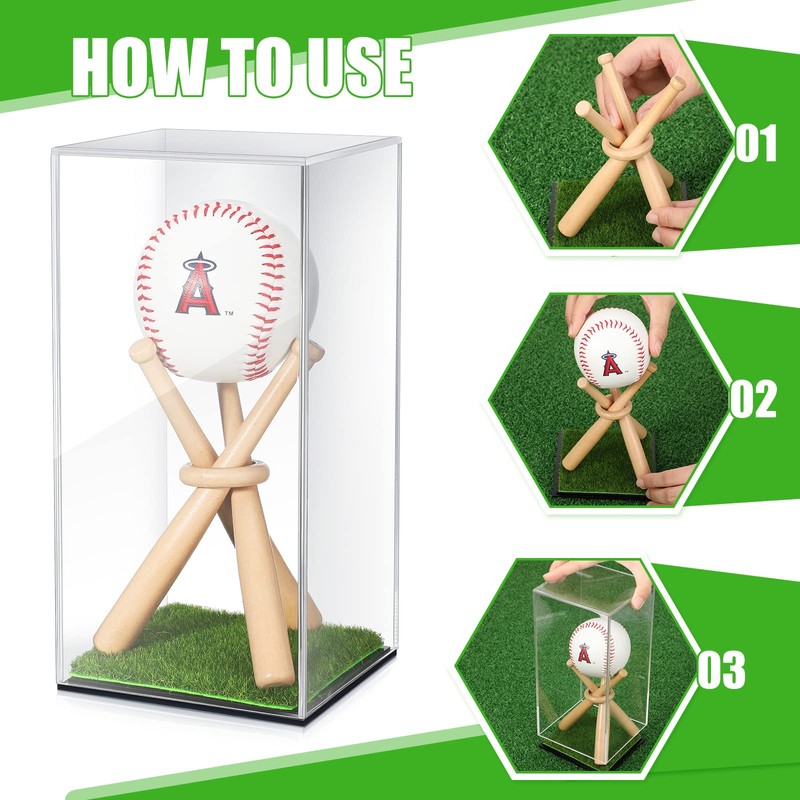 - Display Your Ball Well: our softball display case adopts transparent design, is equipped with black base and artificial grass pad to bring a lively look, you can adjust the mini wood bats and wood ring to get a baseball display stand, then put the rack into the case and put your ball on the rack, finally close the cover to show your autographed ball; You can also use the case to contain 2 balls and the stand to hold 1 ball for displaying