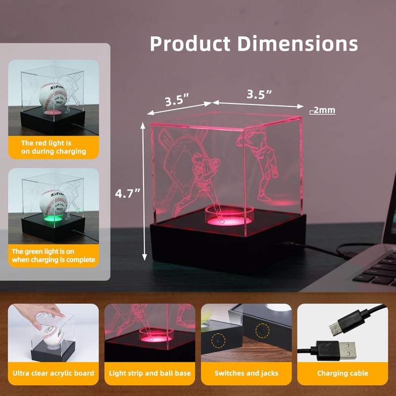 Showcase and illuminate your prized baseball memorabilia with our Baseball Display Case with LED Light. This baseball stands for display merges functionality with artistic design, featuring engravings that enhance the display of your collectible. The back of the baseball ball case is adorned with a meticulously engraved baseball field, while the sides highlight detailed action shots of a batter and a pitcher. These striking engravings add an atmospheric touch, making your baseball memorabilia stand out in style. Equipped with a brilliant LED lighting system, the baseball display cube case highlights your baseball with exceptional brightness. You can choose from 9 different colors or set the lights to cycle through all colors automatically using a simple switch. The lighting is powered by a USB-C cable or a lithium battery, providing convenient and flexible power options. The LED lights also enhance the visibility of signatures and inscriptions on your signed baseball, making it an even more striking display. Made from premium acrylic, this clear baseball display case features UV protection to prevent fading and is designed to be shatterproof and dust-resistant. Baseball case protects your autographed baseball from scratches, minimizes UV exposure, and prevents autographed signatures from fading, ensuring that your collectible stays in excellent condition. The versatile design accommodates not only baseballs but also other collectibles such as softballs, tennis balls, and pool balls. Assembling the baseball case display for balls is straightforward—just open the baseball display case lid, place your baseball, softball, or pool ball onto the center stand, and you're ready to display your memorabilia. The Baseball Display Case with LED Light makes an excellent gift for sports enthusiasts, collectors, and anyone who appreciates functional and elegant display items. It's perfect for occasions like Father's Day, Christmas, or any special celebration.
