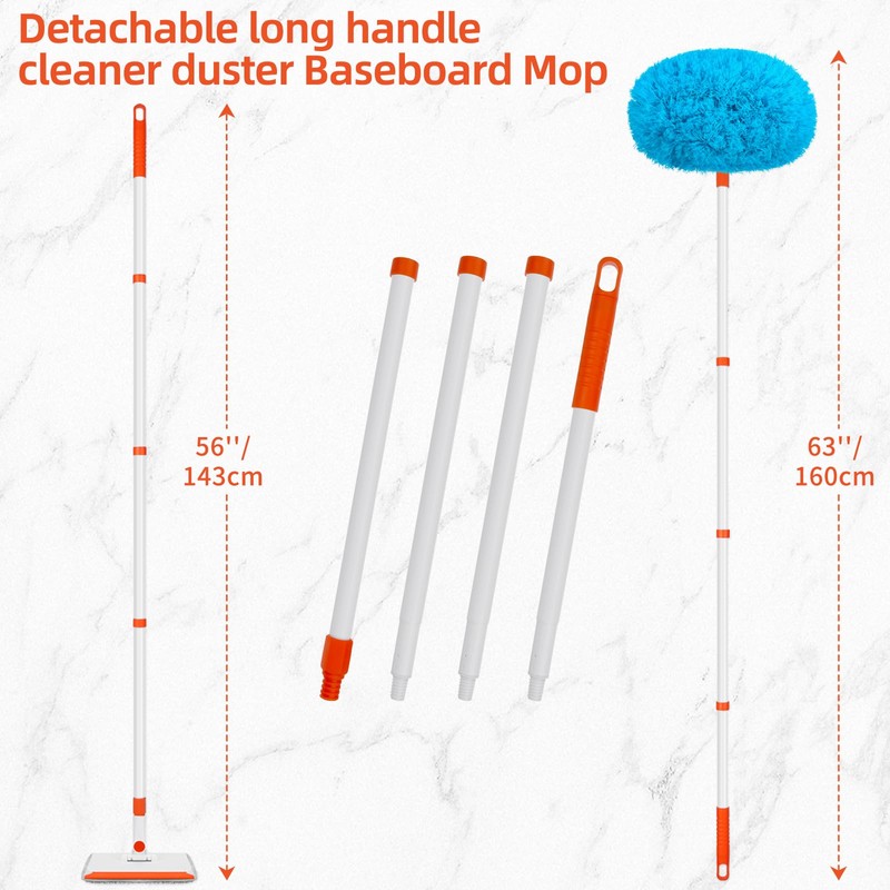 - [Baseboard Cleaner Tool with Handle] Up to 56''/143cm long handle cleaning tool for baseboard. Stooping to clean baseboard, trim, mouldings, ceiling, and floors won't be necessary any longer. It allows you to clean baseboards comfortably from a standing position.