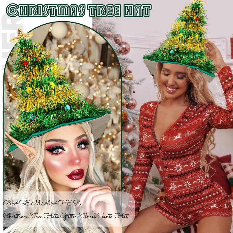 Christmas Tree Hats Xmas Hat Santa Hats Glitter Tinsel Xmas Tree Hat Hair Accessories for Adults Women Xmas Hat Merry Christmas Winter Theme Home Costumes Makeup Party Decoration