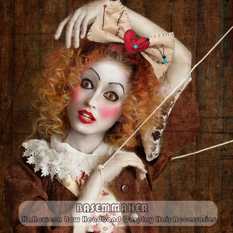 BASEMMAHER Halloween Bow Headband Creepy Doll Bowknot Broken Heart With Pins Bow Head Hoop Evil Doll Headwear Cosplay Costume Hair Accessories for Women Girls Halloween Party Masquerades Dress Up