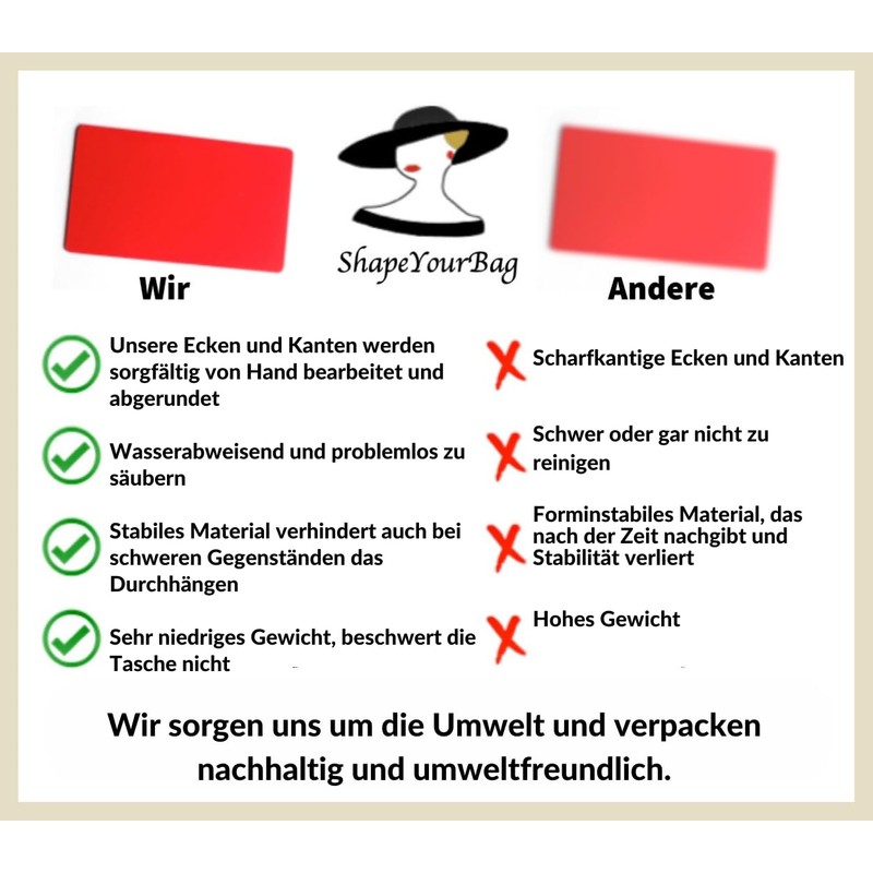- The corners of each individual base are rounded by a special machine by hand so as not to endanger the fabric of your bag.