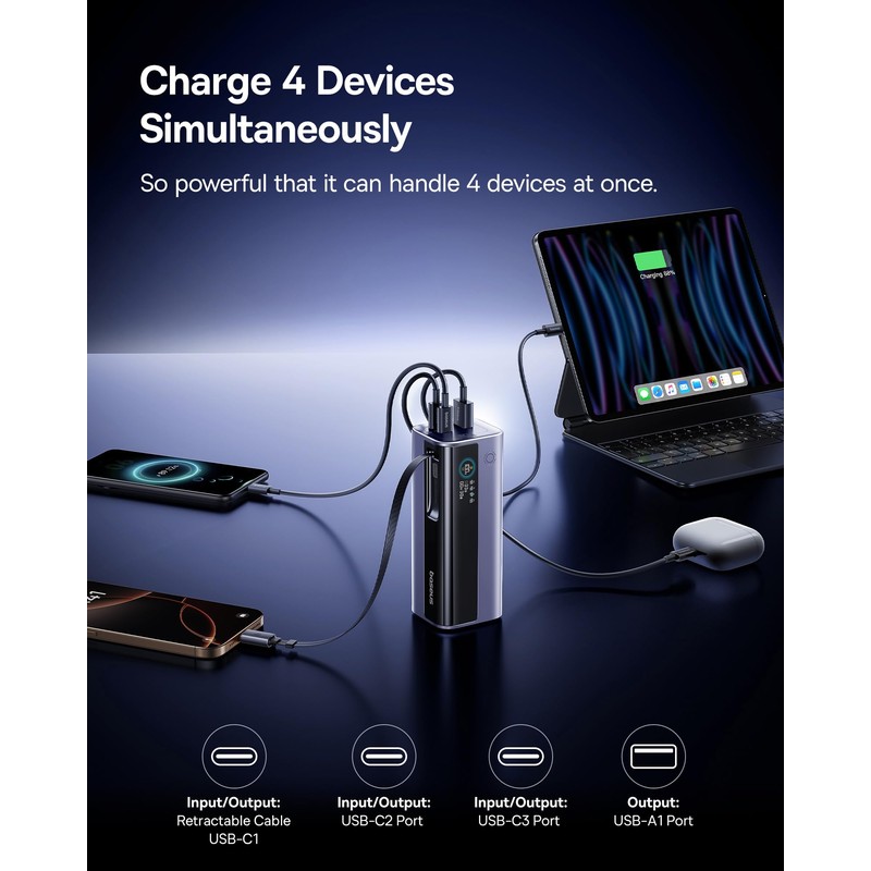 - Built-in 100W Retractable Cable (1.97ft) Tangle-Free & Durable, no more messy cables! The power bank's built-in retractable USB-C cable pulls out for instant charging and retracts with a gentle tug. Tested to withstand 30,000 stretches, it's built for convenience and longevity.