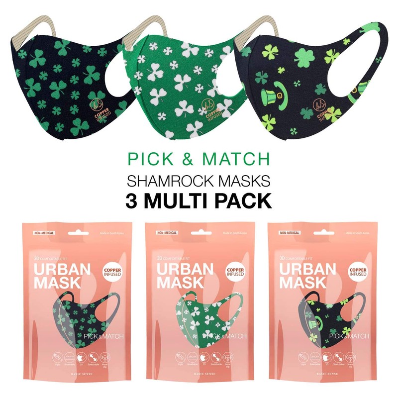 Basic Sense 3 PCS Copper Irish Shamrock Face Masks For St. Patrick Day Green Clover Washable Reusable Face Coverings Mask Made in South Korea