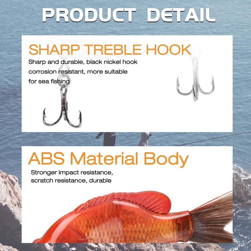 - High Quality Material: The product is made of ABS plastic, so it is durable and can withstand the harsh environment and the bite of fish; Equipped with built-in rattle, it is easy to throw, slow to sink, and can also emit bass vibrations during swimming to attract fish.