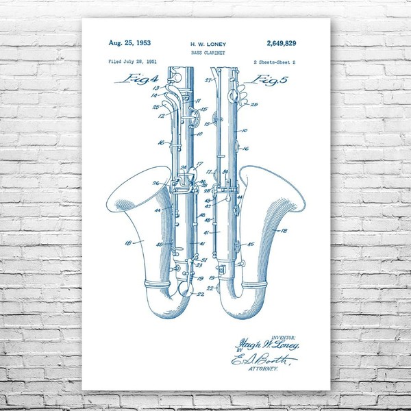 - 12" x 16" poster print featuring a Bass Clarinet patent illustration on a Blue & White style background. Designed by Patent Earth™, this wall art is made to order and customized with your choice of size and background!