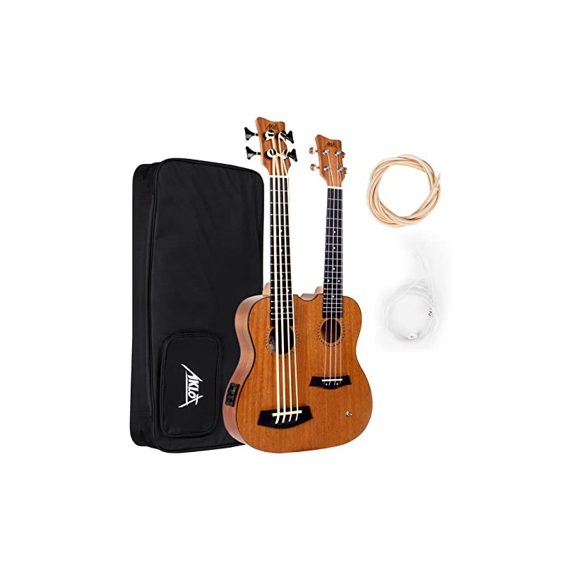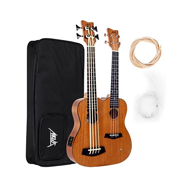 Bass Ukulele, AKLOT 28 Inch Double Necks Ukelele Custom-made Headstock Full Mahogany 4 Strings Uke & 4 String Bass with Gig Bag
