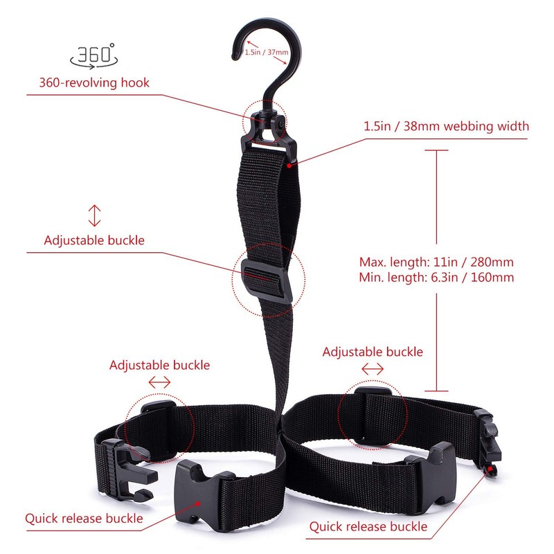 | Material Type: | Constructed from durable 1.5in / 38mm width webbing equipped with high strength ABS plastic buckles and 360-revolving hook |