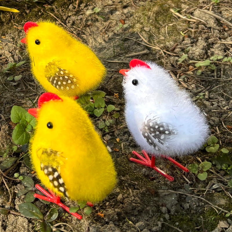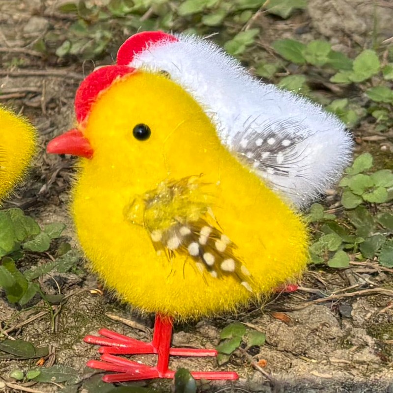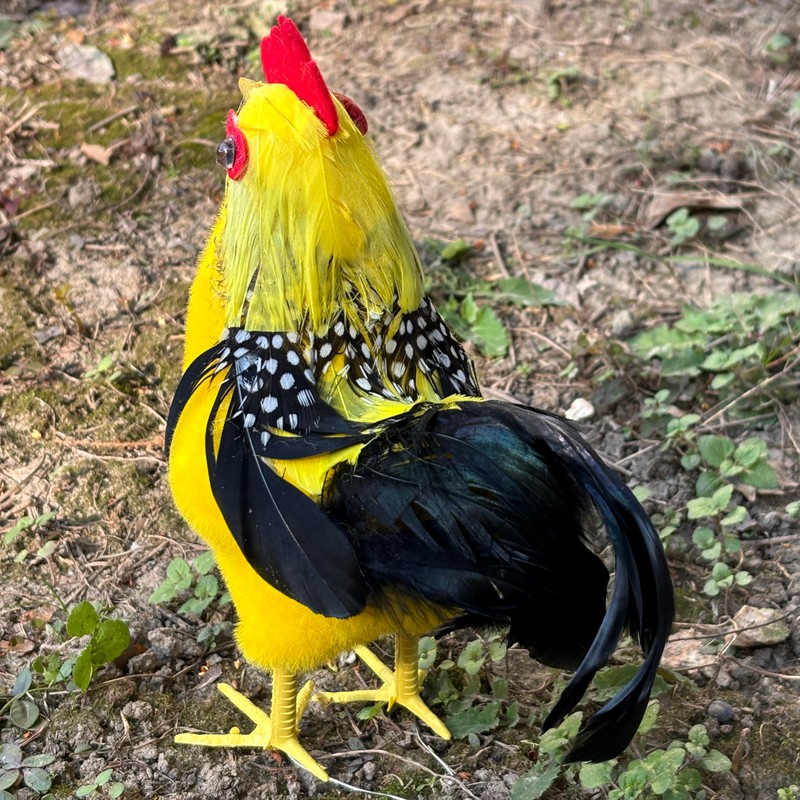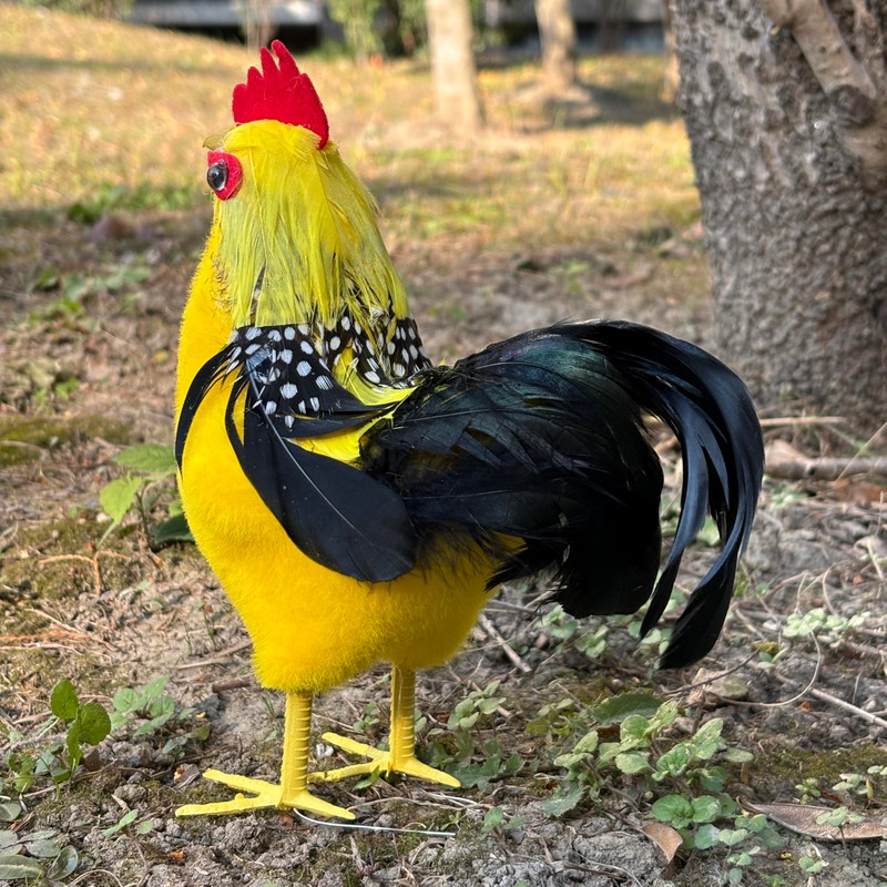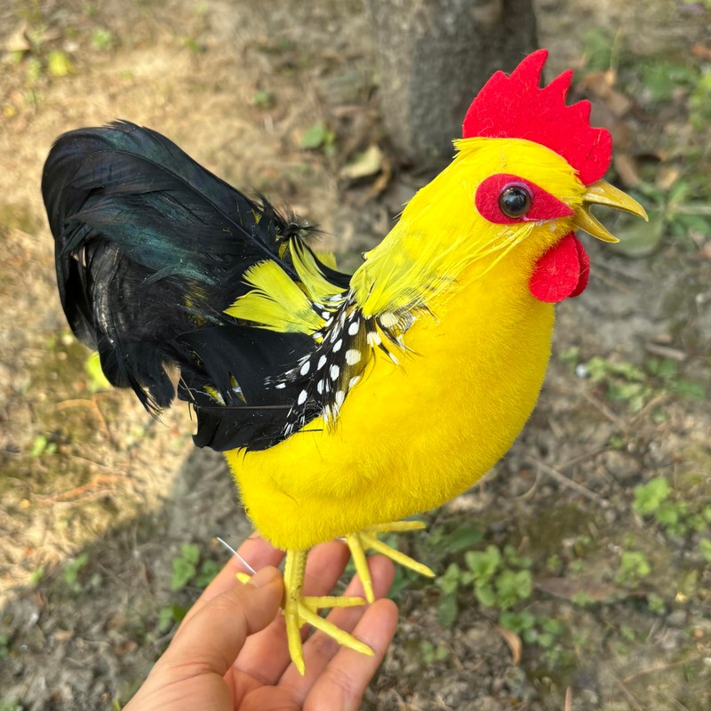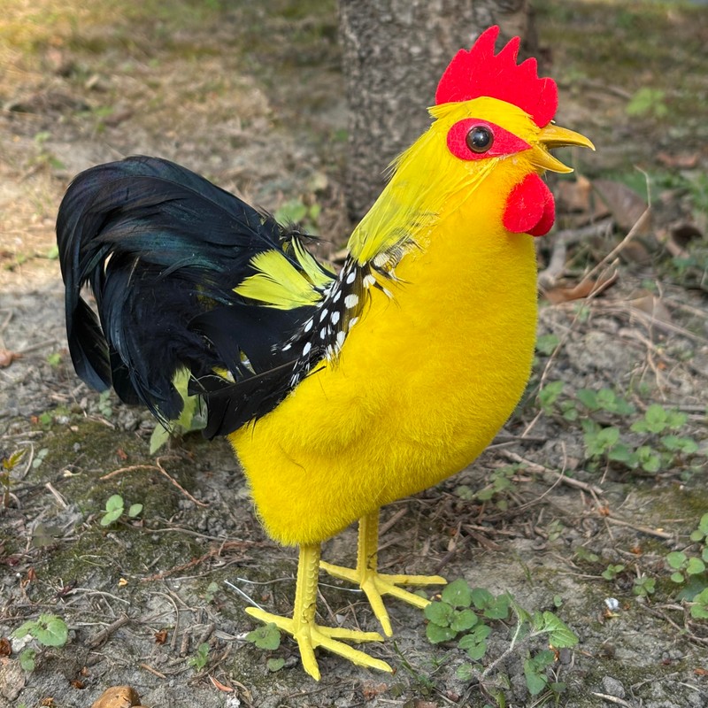 - Vibrant Colors: Featuring a striking rooster with red accents and adorable chicks in yellow and white hues. Durable Construction: Made from high-quality foam, covered with faux fur and real feather.
