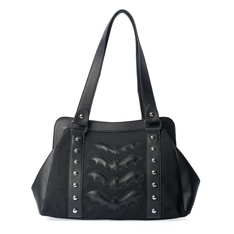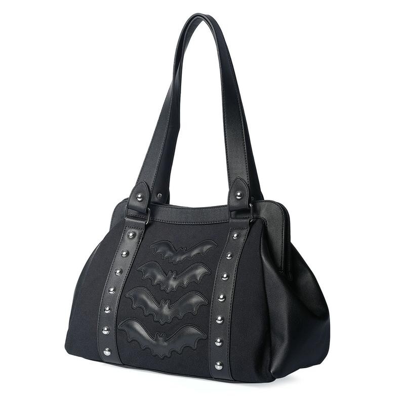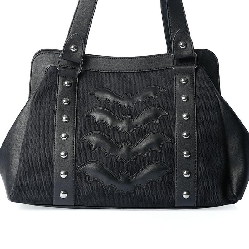 Add a bold statement piece to your wardrobe with the bat canvas studded shoulder bag. Adorned with sleek studs and rugged canvas exterior, this bag commands attention wherever you go, leaving a trail of intrigue in your wake. The silhouette of leatherette nocturnal bats, rendered with meticulous detail, adds an edgy charm making a perfect dark aesthetic accessory. The bag is large enough to fit a tablet, full sized wallet, phone, and much more.