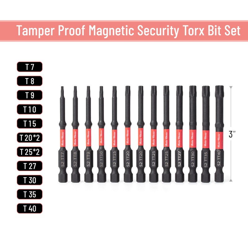 Bates- Impact Torx Bit Set, 13 pcs, 3-Inch Long, 1/4" Hex Shank TT7-TT40, Security Torx Bit Set, Tamper Proof, Magnetic Holder and Storage Case