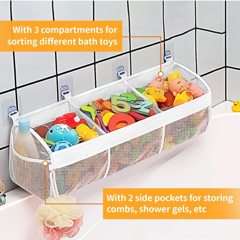- 【Three Compartments & Two Side Pockets】Our bath toy storage comes with 3 separate compartments and 2 side pockets, which can be used to sort and store a variety of your child's bath toys and bathroom essentials, so that your bathroom is always clean and tidy.
