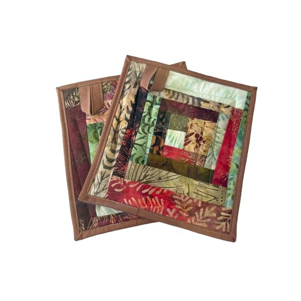 Update your kitchen linens with this set of two quilted fabric patchwork pot holders. They were made with a variety of earth tone hand dyed Indonesian batik fabrics. Each hot pad has a layer of Insul Bright's thermal batting and low loft, cotton batting to protect from heat. Measures 7.5 X 8.25 inches each, approximately. NOT microwave safe. Machine washable. May use a hot iron.