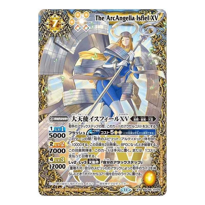 - ★Battle Spirits Dream Booster "Circular Hikari (BSC45) Recording ■Card Name: Archangel Isfeel XV ■Card Name: The ArcAngelia Isfiel XV (w/ Secret) ■Rarity: XV Rare ■Type: Spirit ■Cost: 7 / Reduction Symbols: 5 / Yellow / Ganga / Celestial Spirit ■Lv Cost: (1) Lv1 5000