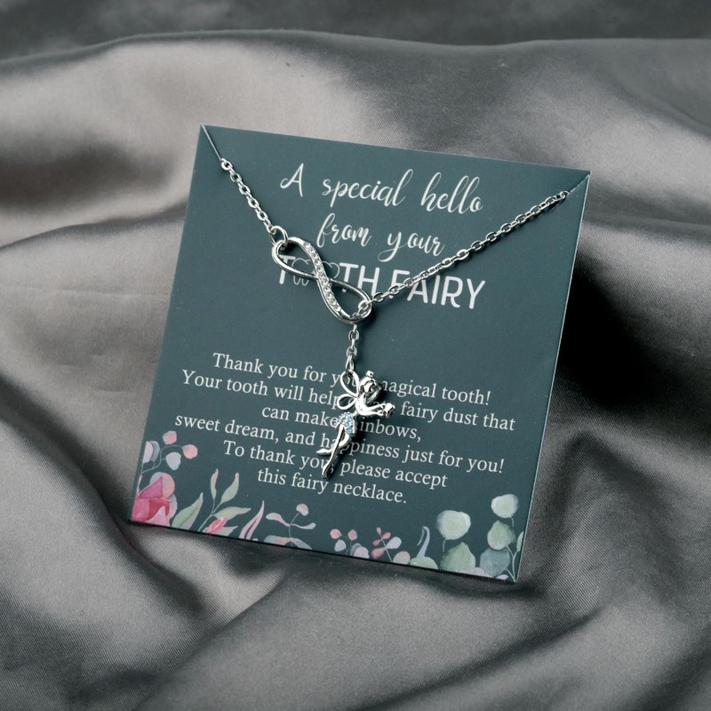 - Card With Words: A special hello from your TOOTH FAIRY.Thank you for your magical tooth! Your tooth will help create fairy dust that can make rainbows, sweet dream,and happiness just for you! To thank you, please accept this fairy necklace.