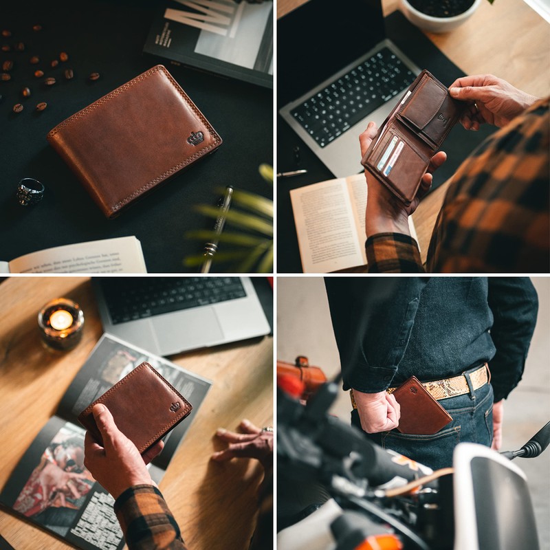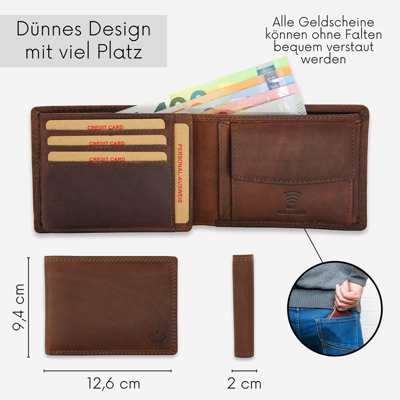 - Premium quality: the full leather wallets are made from 100% genuine and vegetable-tanned cowhide leather. The high-quality natural leather and the precise workmanship make the wallet robust and durable and guarantee a long service life.