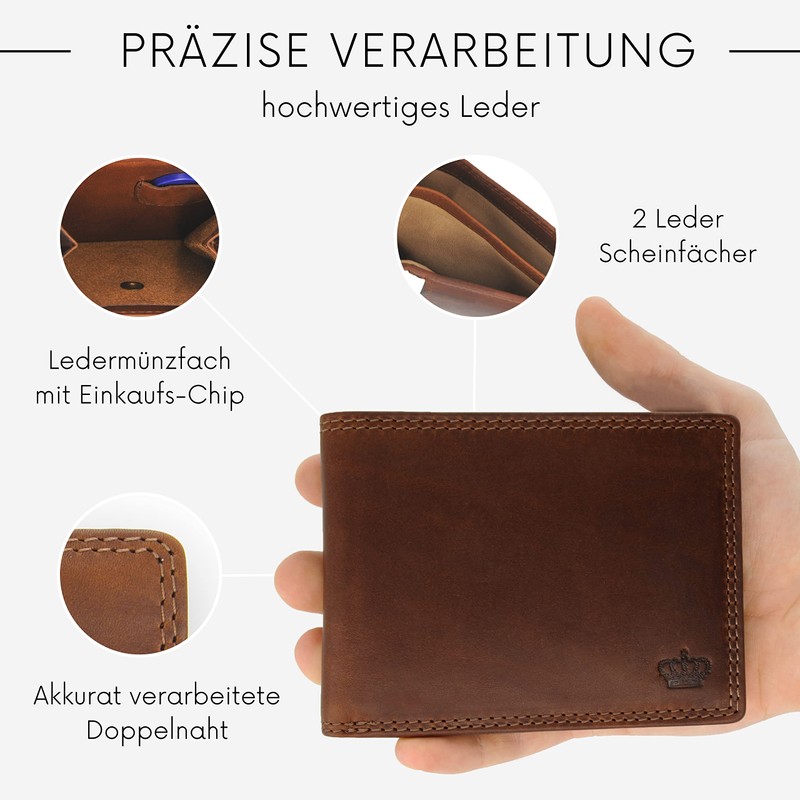- 2 note compartments + 1 coin compartment: the genuine leather men's wallet has a leather-lined double note compartment. All Euro notes can be conveniently stored without creases. Large full leather coin compartment with press stud and shopping trolley token.