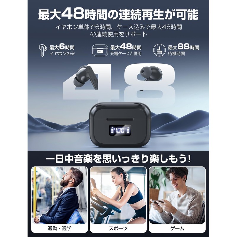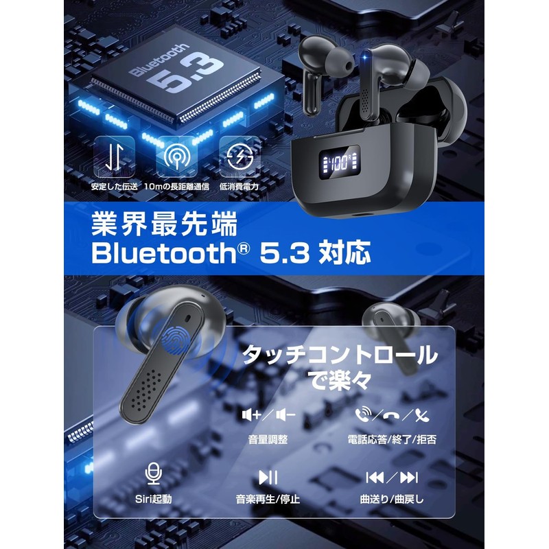 Bawweri Wireless Earphones, Bluetooth 5.3, Open the Lid, Connect, Hi-Fi Sound Quality, Up to 48 Hours of Music Playback, LED Battery Remaining Display, Touch Control, Fully