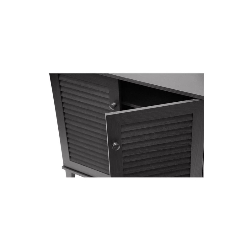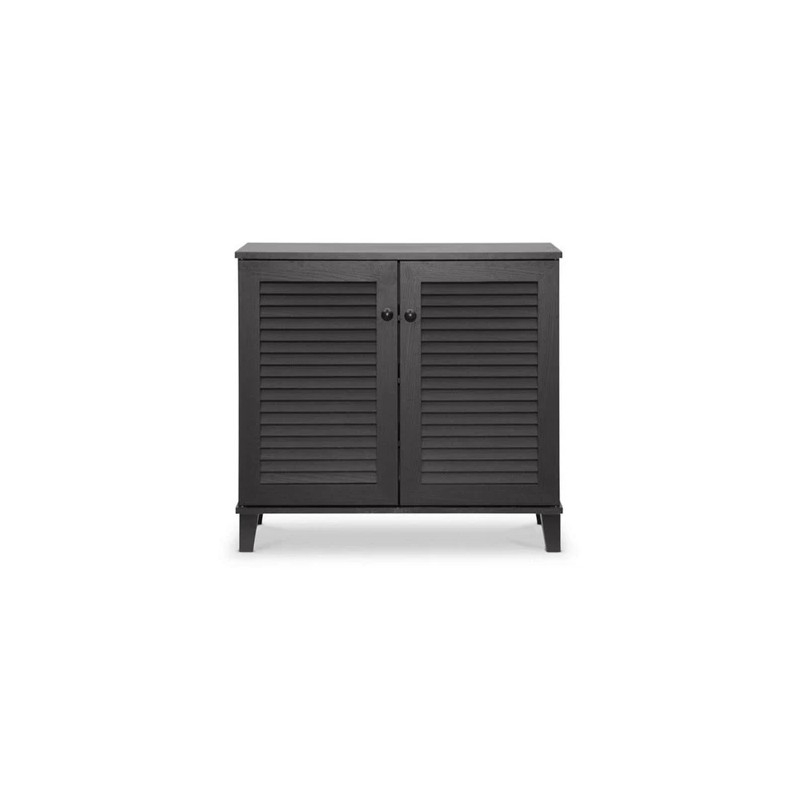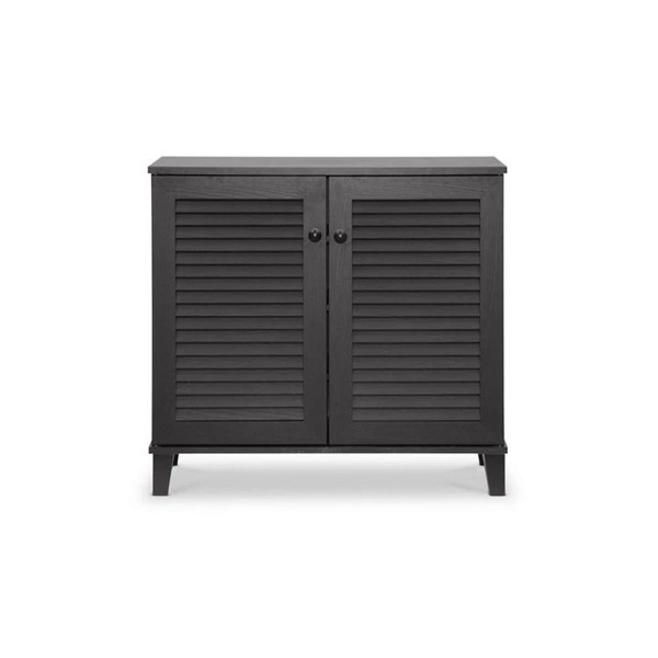 Store your shoes on the sly with our Coolidge Espresso Shoe-Storage Cabinet. With such sharp styling, you won’t be forced to stow your footwear in an upstairs closet. Sure, this completely contemporary cabinet features four shoe-worthy shelves, but its attractiveness offers fantastic flexibility in where to place it. The slatted front doors include sturdy solid-wood handles and the espresso finish looks fabulous.