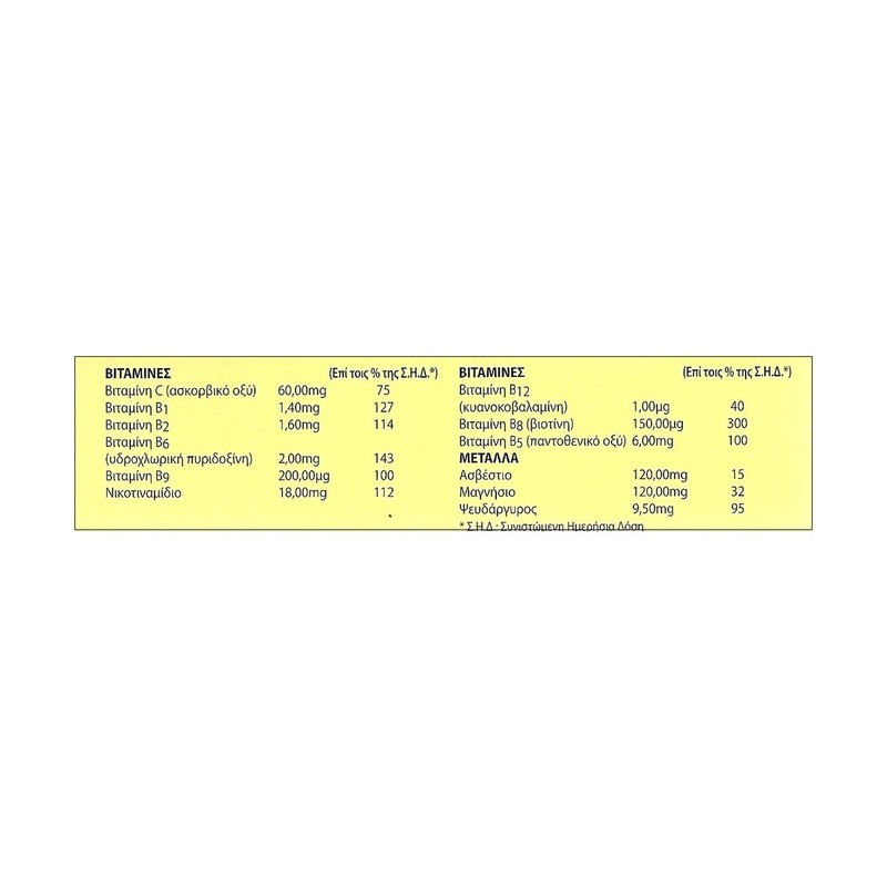 Vit C, Vit B1, B2,B6,B9, B12, B8, B5, Calcium, Magnesium, Zinc.