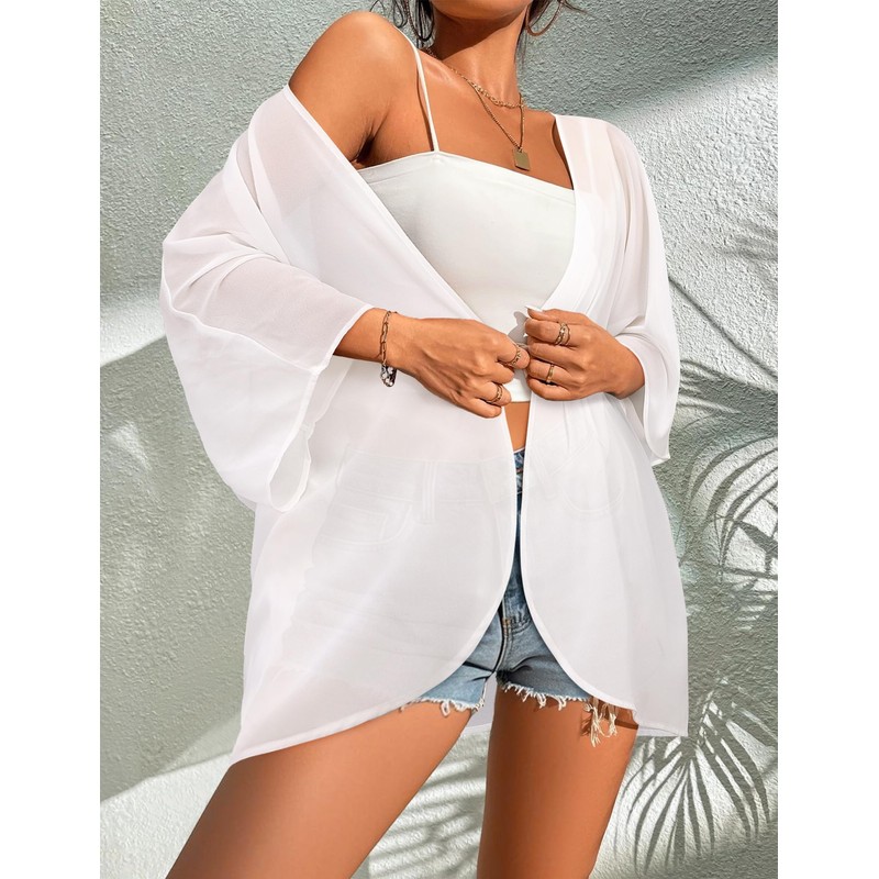 BB&KK Womens Kimono Cardigans Beach Cover ups Swimwear Puff Sleeve Loose Casual Summer Tops (White, S)