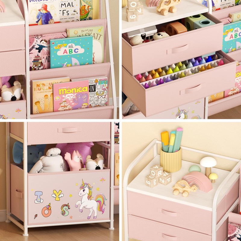 - [Toy Storage with Bookshelf]Dual-Use Cartoon Bin! Removable fabric box acts as a toy storage shelf for stuffed animals, while drawers hide puzzles and small toys