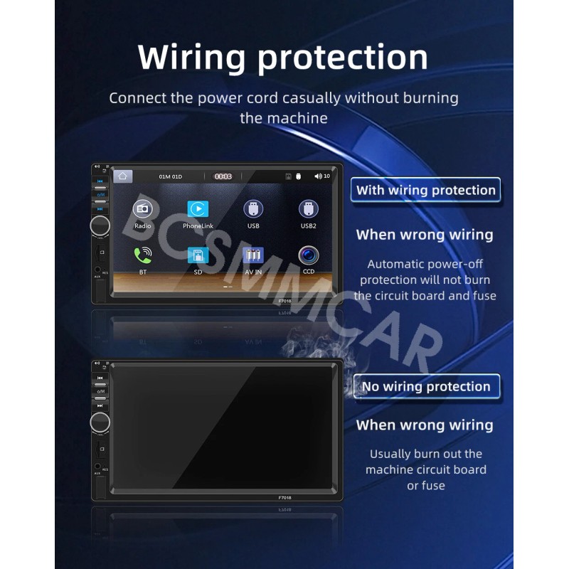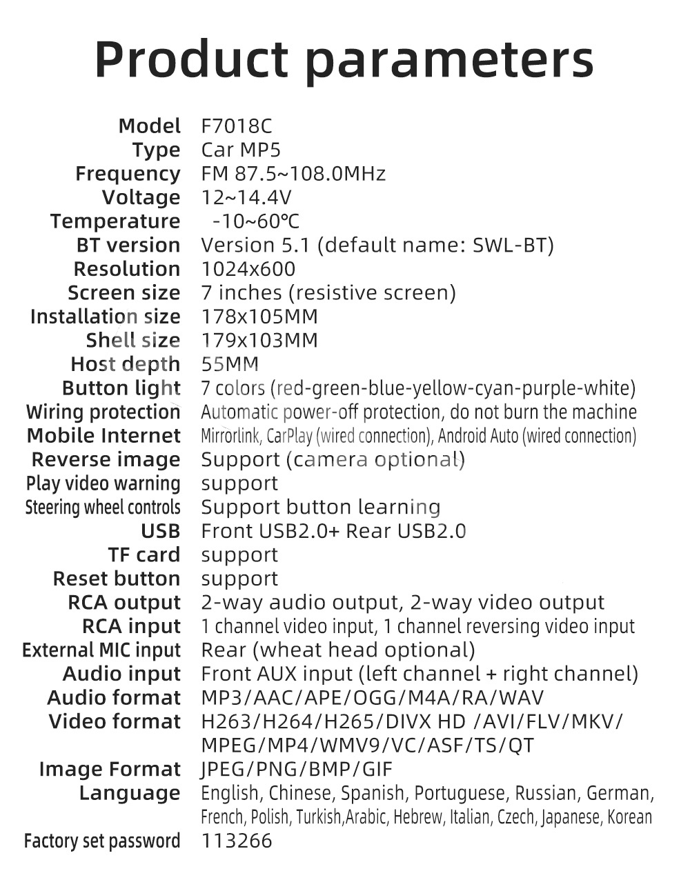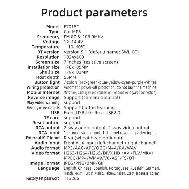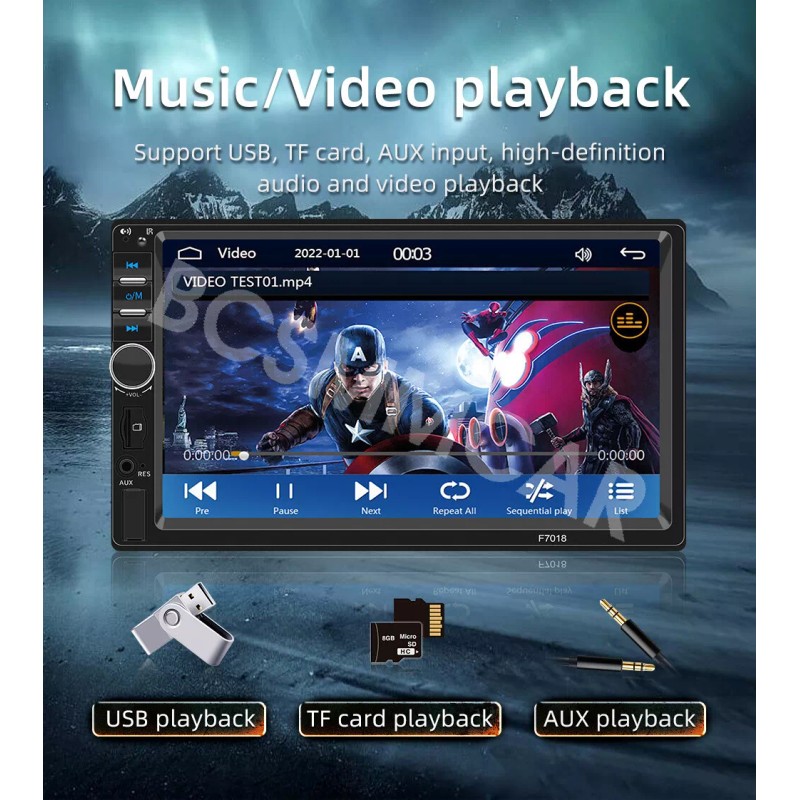 - Support 2: Audio,Video,FM,Mirror Link,TF,AUX,USB
