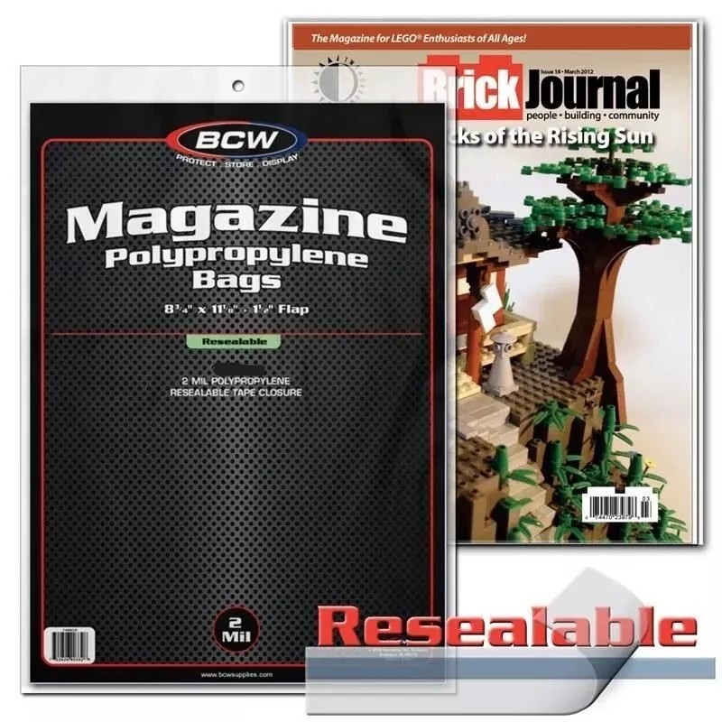 The BCW Resealable Magazine Bags are an acid free, archival quality product made of crystal clear polypropylene. These bags have a reusable adhesive tape strip on the body of the bag so the collector can fold the top flap over and lock in the magazine.