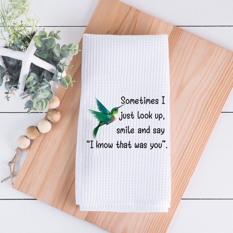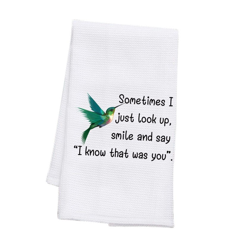 - Towel with Hummingbird Quote: Sometimes I just look up, smile and say "I know that was you". The Hummingbird also symbolizes new beginnings and life, and is also looked upon by many as a sign of fortune and good luck. This hummingbird kitchen towel would make a great Memorial towel, memorial gift, sympathy gift for a Loss of a Loved One.
