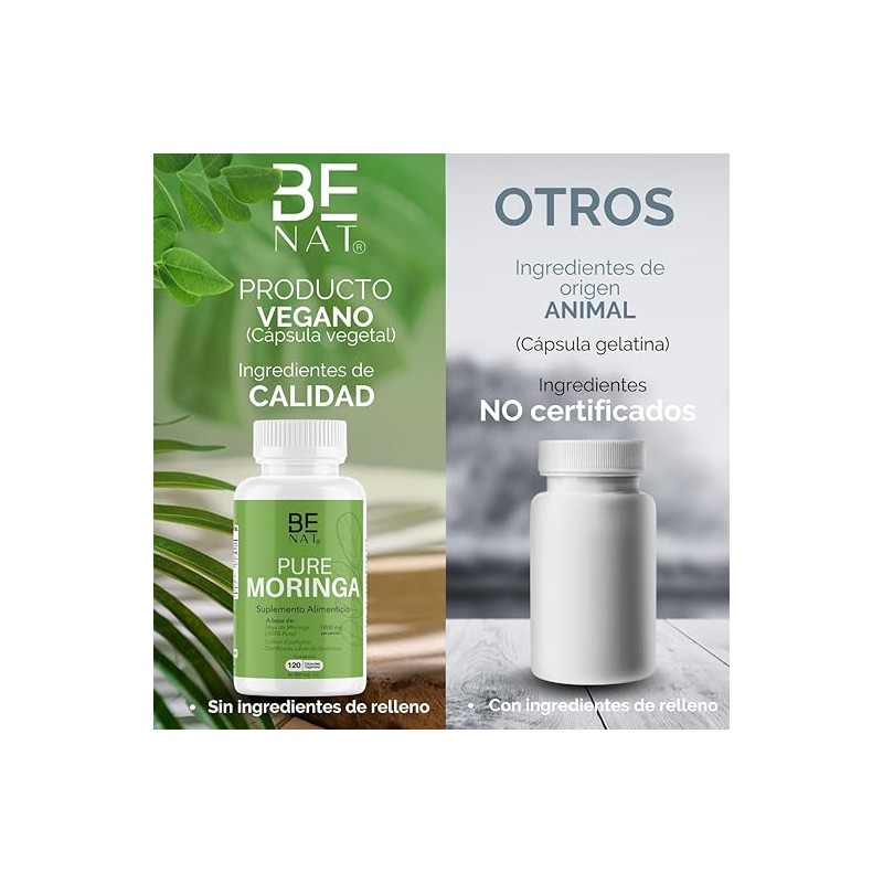 BE NAT | MORINGA HOJA | 120 cápsulas Veganas de 500mg | Fácil absorción a base de Hoja de Moringa 100% Pura, Certificada Libre de Químicos, Calidad Premium | PURE MORINGA | Suplemento Alimenticio Natural.