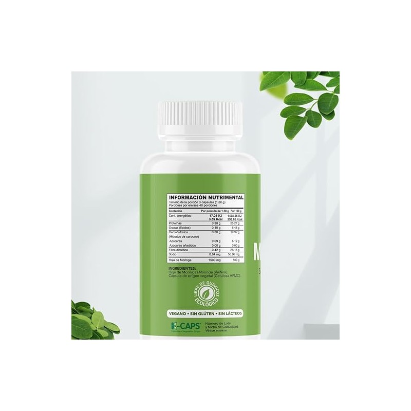 - 💊 Suplemento Alimenticio en cápsula vegetal a base de: HOJA DE MORINGA (Moringa Oleifera) 500 mg