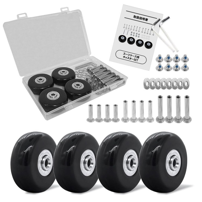 - Silent Caster and Bearing Specifications: Made of high quality rubber that reduces noise when using. It also has high cushioning and absorbs shock on uneven road surfaces, making it easier to use. Bearings are built into the center of the casters for smooth movement. Instruction Manual Included: Beginner to change casters and for beginners to DIY and even women. Comes with a carefully Japanese manual (English language not guaranteed) so it is safe for beginners. 3 Axle Types: The length of the axle varies depending on the suitcase. Our replacement set includes 3 different lengths of axles (12 pieces total) which are commonly used in this set for replacement