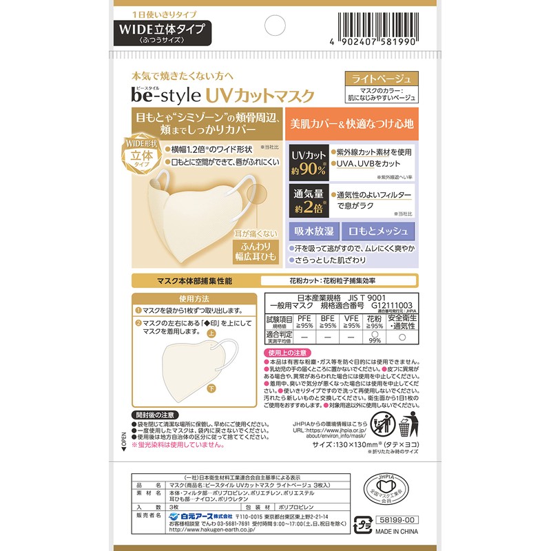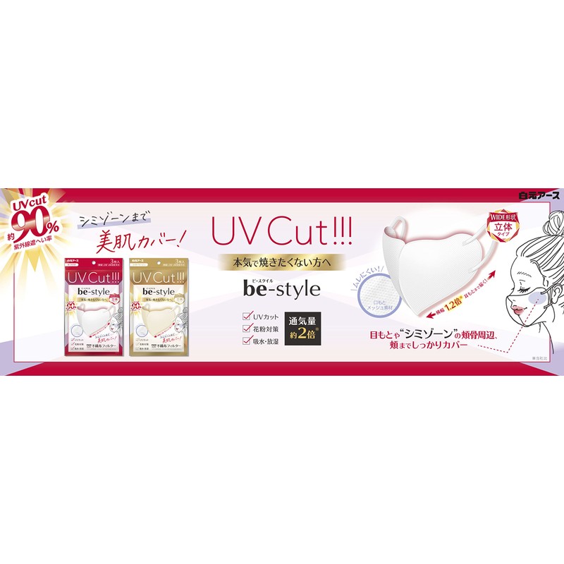 [be-style] 白元アース ビースタイル UVカットマスク ライトベージュ 3枚入×10個セット マスク 女性用